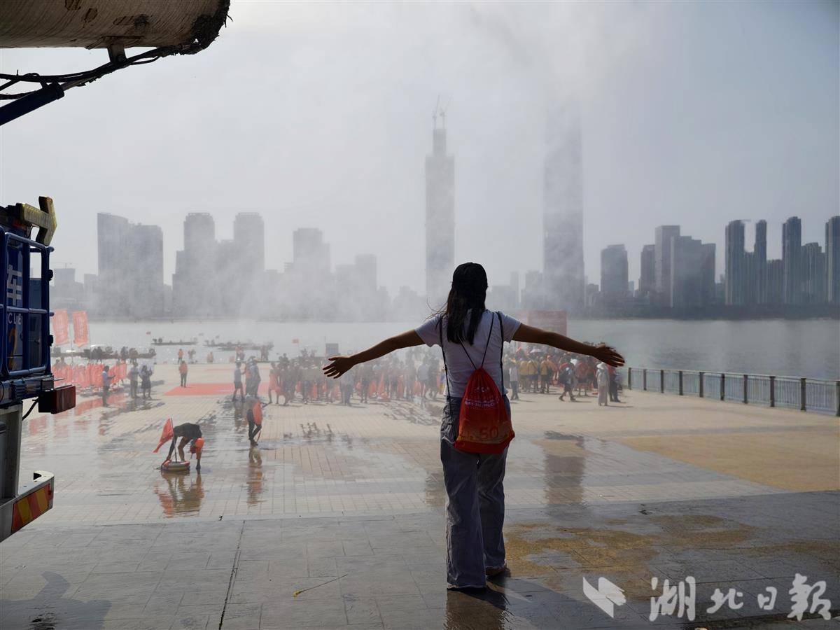 “江岸区环卫部门在现场部署了4台大型雾炮车,2台工作,2台待命”江岸环卫集团有限公司清扫一公司副经理严海告诉记者,雾炮车通过高压风扇将水转化成水雾,平均每台雾炮车可连续喷洒45分钟,喷出5吨水,可有效驱散灼人的暑气。