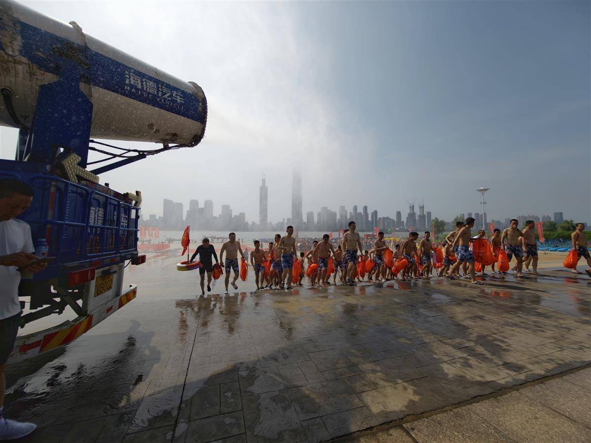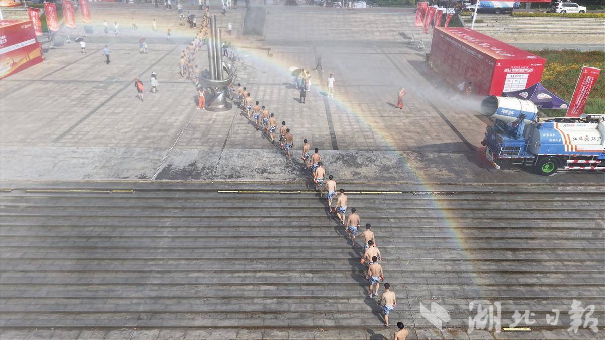 上午10时,气温逼近40度。伴随着热烈的欢呼声,渡江勇士们陆续完赛并踏岸。引擎轰鸣,两台“大炮”启动,阵阵水雾形成“清凉结界”,在阳光下折射出绚丽的彩虹,为激烈的赛事现场增添了一抹独特的浪漫。